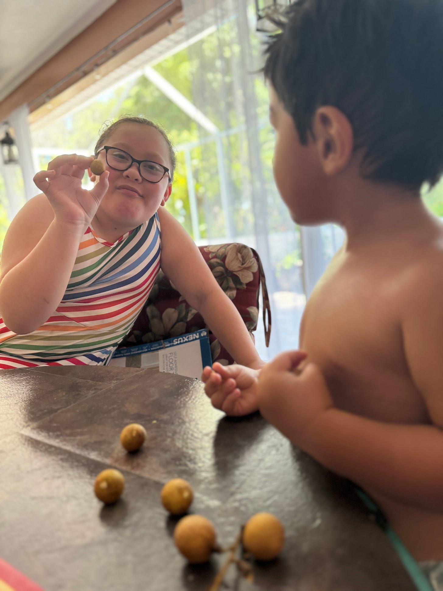 Later, we picked longan straight from the tree, cracking open the smooth shells to reveal the translucent fruit inside. Sweet, juicy, and fragrant, the kids devoured them with sticky fingers and big smiles. What began as a snack turned into a lesson about botany, geography, family history, and joy—because food is never just food; it’s memory, science, and culture all at once.