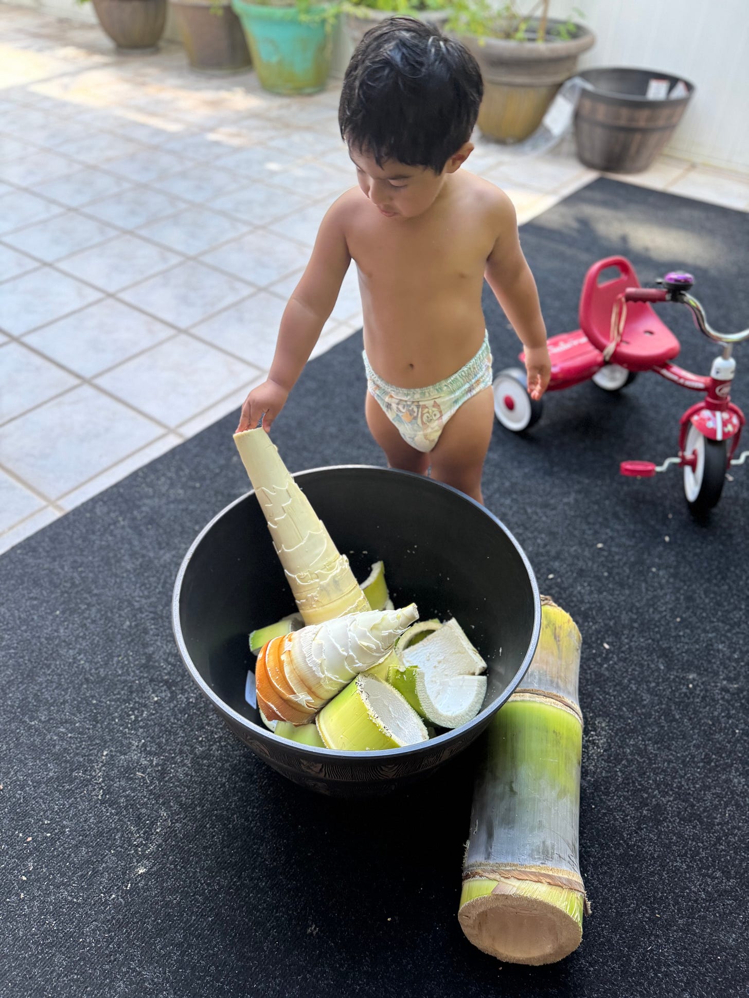 This week’s lessons took us into the kitchen and the orchard. We processed fresh bamboo shoots—an Isaan tradition that connects us to our Thai roots. The kids peeled, sliced, and boiled the shoots, learning not only the careful steps needed to make them edible, but also the stories of their grandmother’s cooking and the flavors of the land she came from.